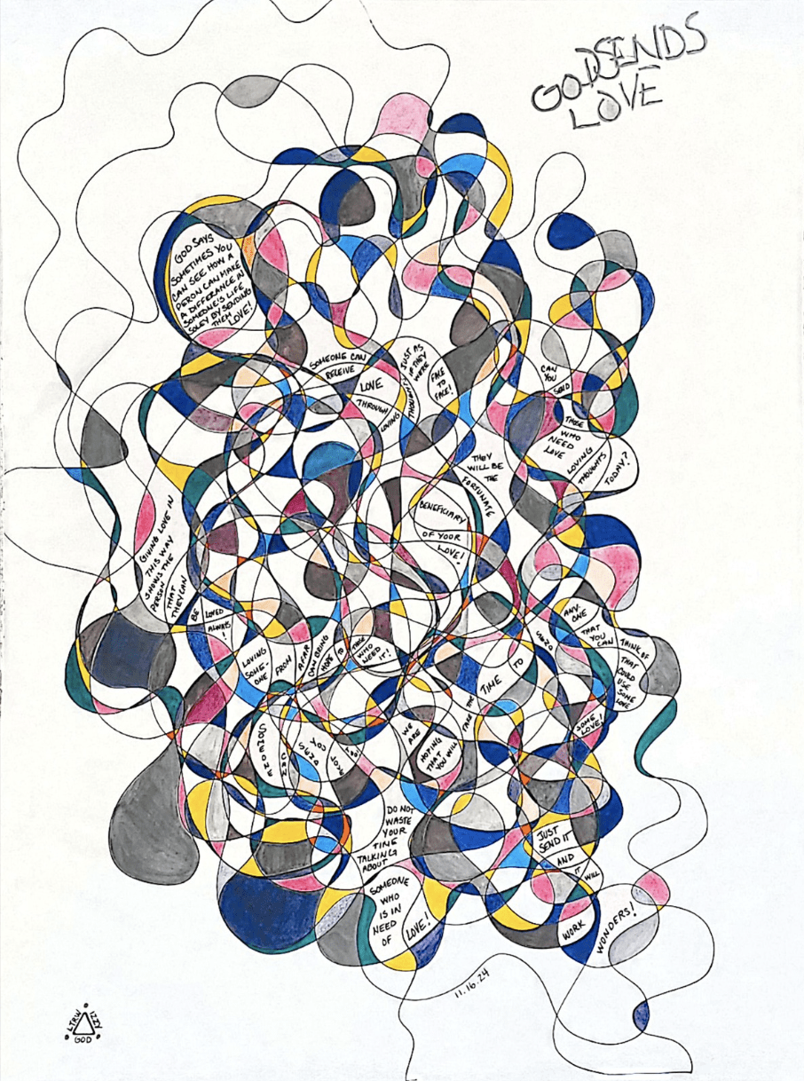Linda T. Rimanelli Worful (LTRW Art) is a mixed-media artist whose work emerges from intuitive automatic writing and drawing. Inspired by received messages that are thoughtfully integrated into each design, she begins with a continuous ink line formed with eyes closed and develops it through layered color, metallic accents, and intentional embellishment. Her luminous compositions explore connection, inner light, and reflection, inviting viewers to engage with both visual energy and deeper meaning.