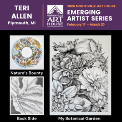 Join us February 21 from 12 – 2 pm for the opening of Collective Inspirations featuring the Chelsea Painters group of artists as well as the Emerging Artist exhibit highlighting Plymouth artist Teri Allen. Also on view are the paintings of Kenneth Rosenthal at Tuscan Café and Ashwini Prabhakar at Tuscan Café and the Northville City Hall in Downtown Northville.