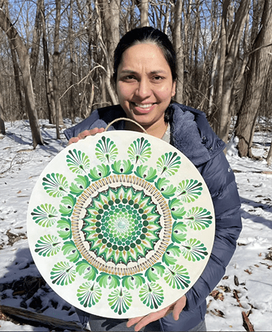 Snehal Ambre is a mandala and mixed-media artist whose work is inspired by the vibrant rhythms of nature and the depth of human emotion. Growing up amid the rich, colorful landscapes of India’s west coast, Snehal has been drawn to creative expression since childhood, channeling her experiences into intricate patterns and intuitive designs. Her artwork invites viewers to slow down, breathe, and reconnect with their inner world. Each piece functions as a visual meditation—evoking calm and introspection while remaining vivid, expressive, and full of life. Through her evolving practice, Snehal explores the relationship between color, pattern, and feeling, celebrating mindfulness, vibrancy, and inner beauty. The demo will focus on how to create mandala artwork—meaningful pieces designed to bring harmony, color, and emotional presence into your homes, yoga studios, or meditation spaces.