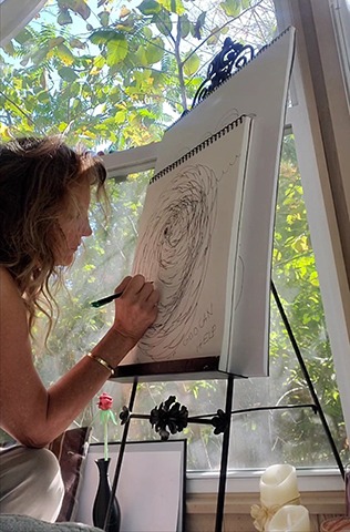 Linda T. Rimanelli Worful (LTRW Art) is a mixed-media artist whose work emerges from intuitive automatic writing and drawing. Inspired by received messages that are thoughtfully integrated into each design, she begins with a continuous ink line formed with eyes closed and develops it through layered color, metallic accents, and intentional embellishment. Her luminous compositions explore connection, inner light, and reflection, inviting viewers to engage with both visual energy and deeper meaning.